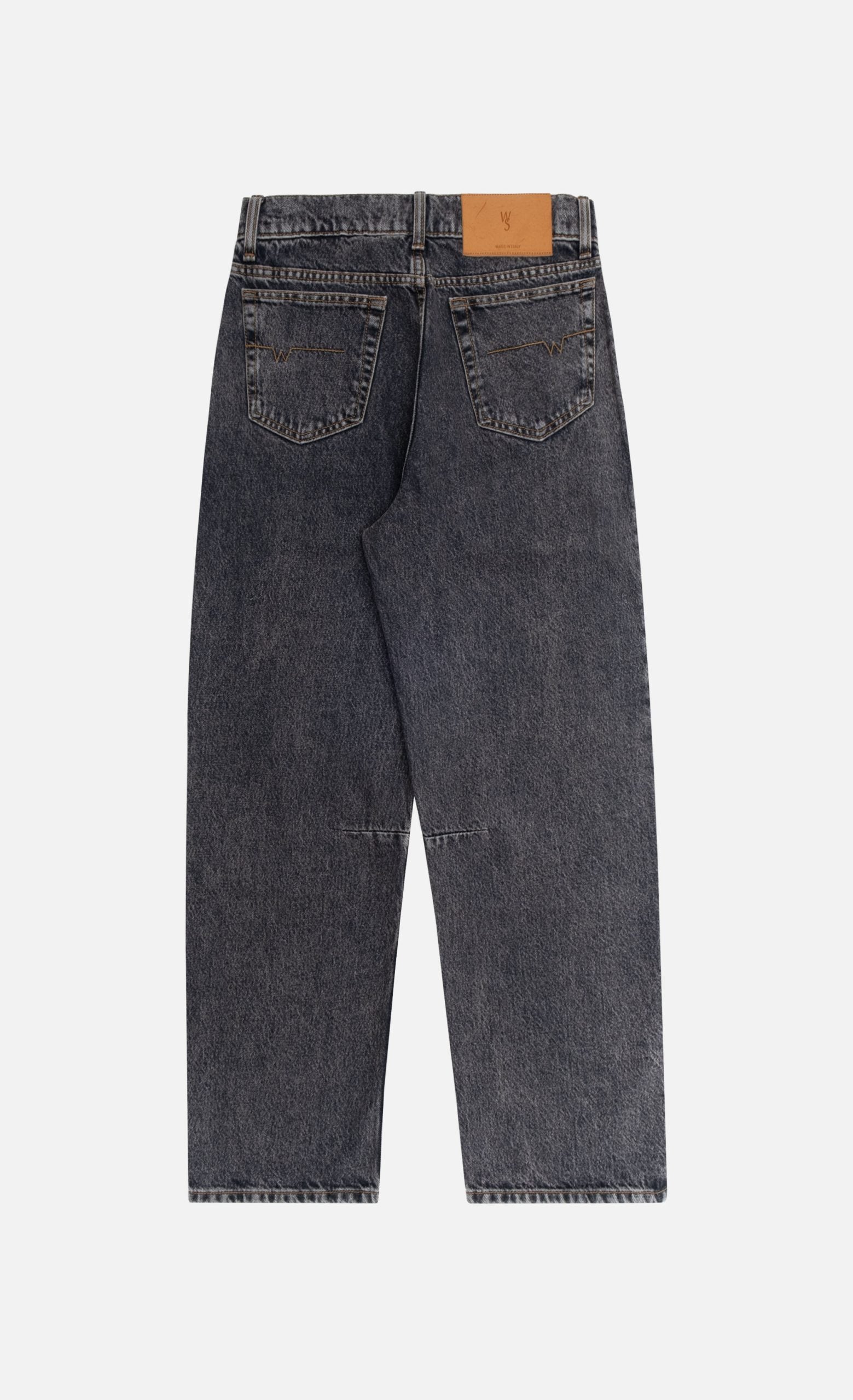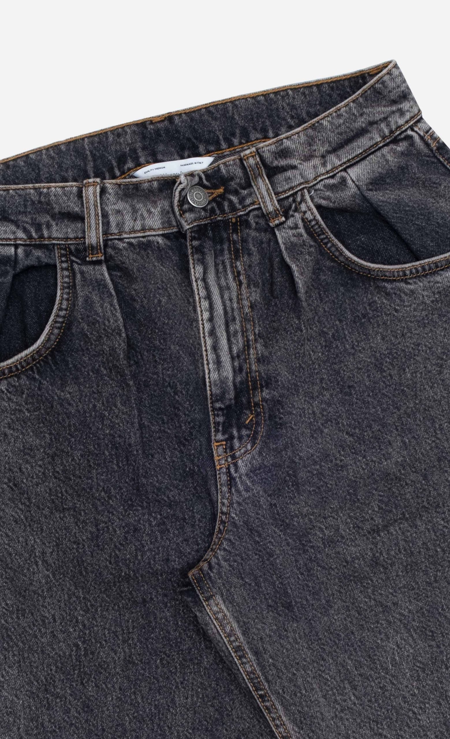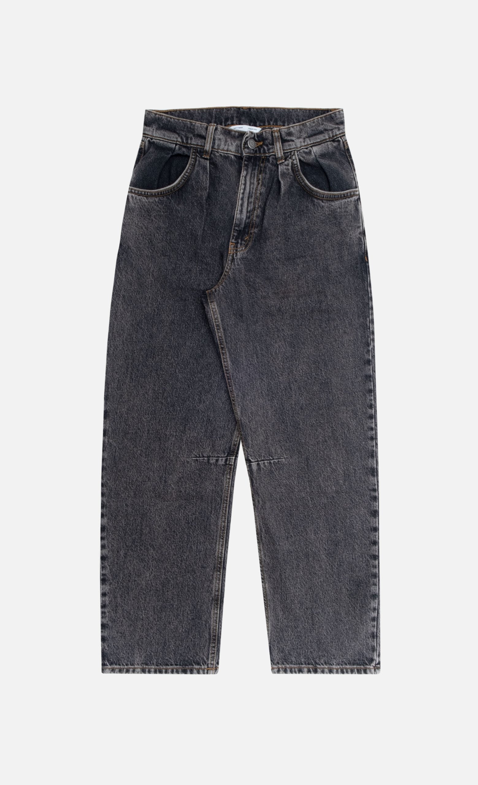 Baggy fit with front pleats and balloon-effect stitching on the knee.