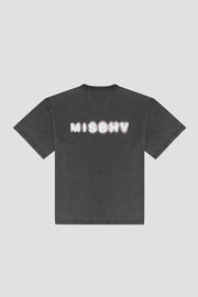 Cotton short sleeve T-shirt in washed black color. Features a print at front and back, and a ribbed crewneck.
