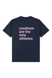 The catna tee in navy/pink features TNO's classic emblem logo embroidered on the left chest, while the back carries the statement phrase: creatives are the new athletes, screen-printed in pink.