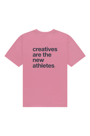 The catna tee in bonbon features TNO's classic emblem logo embroidered on the left chest, while the back carries the statement phrase: creatives are the new athletes, screen-printed in black.