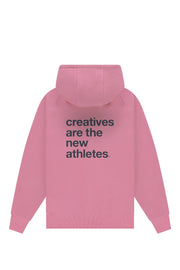 The rebranded catna hoodie in bonbon features TNO's emblem logo embroidered on the left chest and bold catna phrase “creatives are the new athletes” printed across the back.