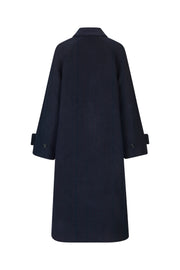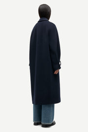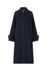 Long coat with a loose fit. Hidden button closure on the front. Welt pockets on the front and inner pocket. Adjustable cuffs. Padded with Meida insulation. Main material is Manteco MWool®, woven in Italy from a recycled wool-blend.