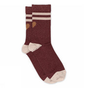 Glitter socks from MPwoman, with soft cotton on the inside to prevent itching. The socks have diagonal stripes on the shaft and a heart motif on the back of the shaft.