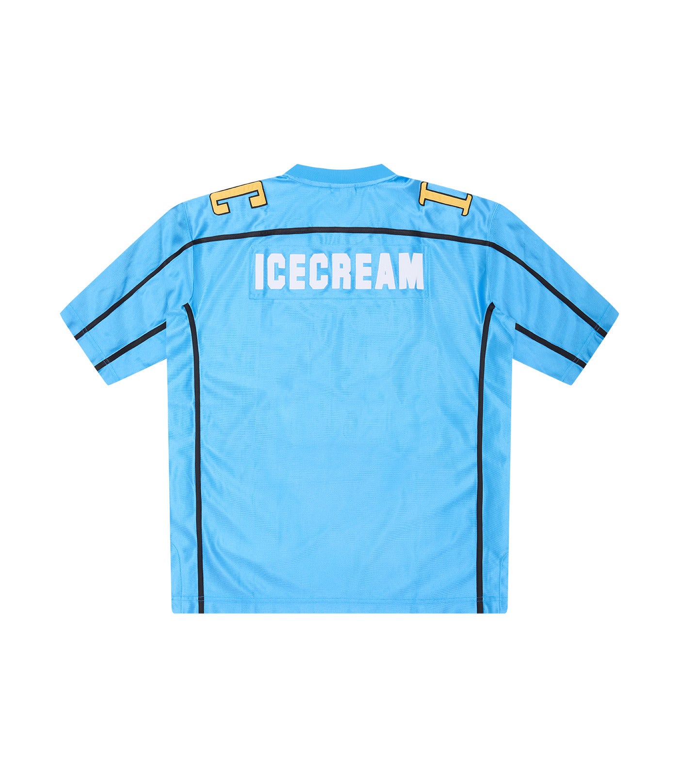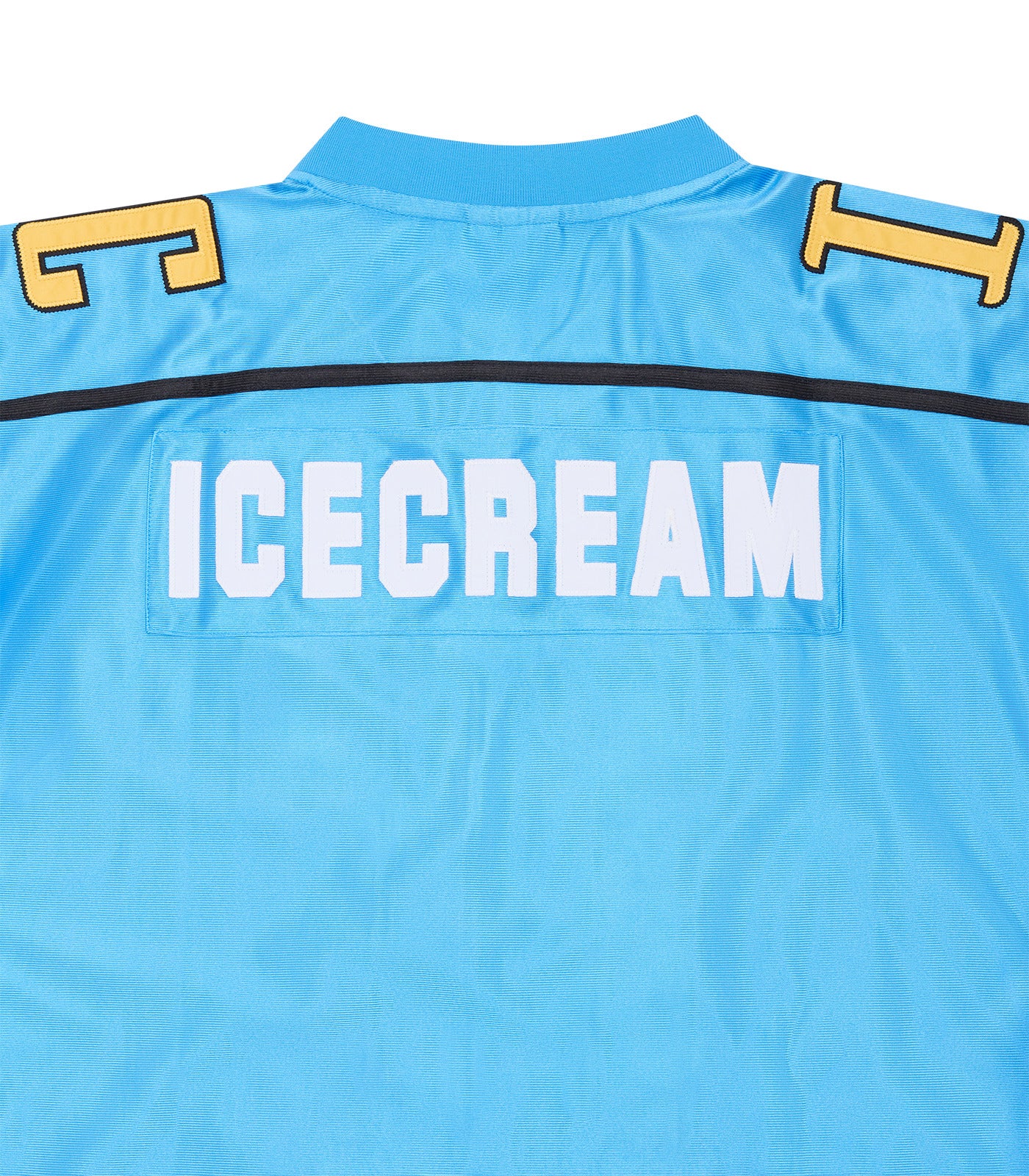 ICECREAM Spring ’26 - The IC Football Shirt features a satin construction, detailed with an all-over ICECREAM satin appliqué graphic across the front and shoulders, and finished with the ICECREAM logo at the back shoulders.