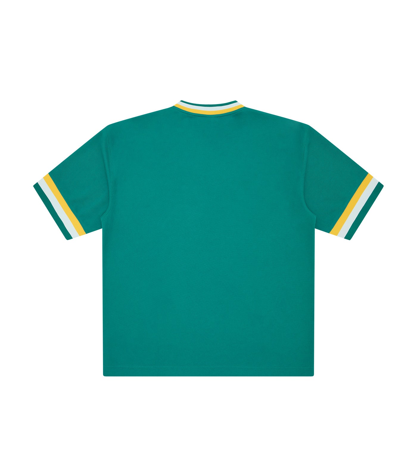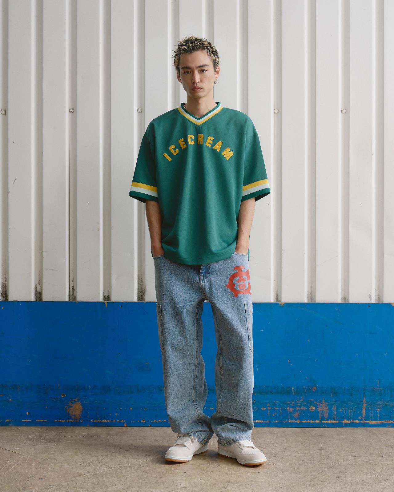 ICECREAM Spring ’26 - V-Neck Sports Jersey featuring a V-neckline and ICECREAM twill appliqué on the chest, finished with striped tape at the neck and sleeve hems.