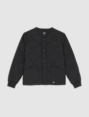 Lightweight and element-ready, the Samburg liner jacket is filled with mid-light synthetic filling that's warm without weighing you down. It features oversized diamond quilting at the body, snap closures, patch pockets, and elastic cuffs for extra comfort. This jacket is finished with the iconic woven Dickies label on the left patch pocket.