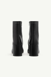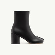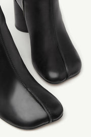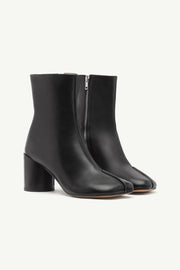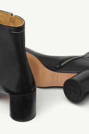 These slip on ankle boots are made from shiny leather with an anatomic toe and cylindrical heel. They hide a discreet zip closure on the inside of the style and are detailed by the brand's new stitch-out technique. MM6's discreet yet distinct signature, a horizontal white stitch line, is present on the back of the shoes.