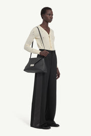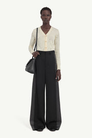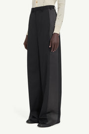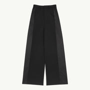 A classic silhouette disrupted by unexpected detail. These wide-leg trousers balance sharp tailoring with a fluid drape, while satin side panels introduce a tactile contrast. Exaggerated pockets down the front elongate the form, while MM6’s signature white stitch line subtly marks the back.