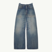 These jeans reinterpret workwear codes with a directional twist. Crafted from mid-wash denim with heavy fading and whiskering, they feature a wide-leg silhouette with horizontal seams that break the leg line. A raw-edged waistband reinforces the lived-in feel while the MM6 white stitch line signs off the design with quiet precision.