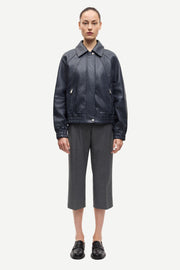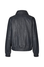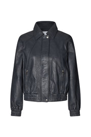 Textured leather jacket with a loose fit and cropped silhouette. Zipper and snap button closure on the front and zipped cuffs. Zipped side slit pockets on the front. Elasticated hem and cuffs. Fully lined. Main material made from lamb leather. This product contains leather sourced from LWG-certified suppliers. LWG promotes responsible environmental practices across the leather supply chain.