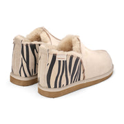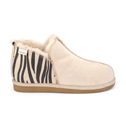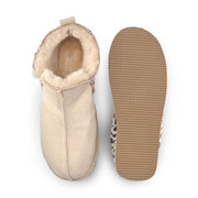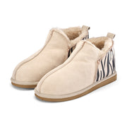Shepherd Annie is a pair of sheepskin slippers which are a little higher than ankle high. The slippers have decorative stiching on the outside. They have fabric binding and a tag on the back made from suede. The outer sole is made from EVA.