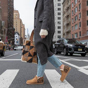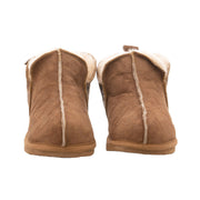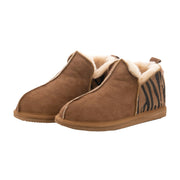 Shepherd Annie is a pair of sheepskin slippers that are a little higher than ankle-high. The slippers have decorative stitching on the outside. They have fabric binding and a tag on the back made from suede. The outer sole is made from EVA.