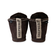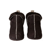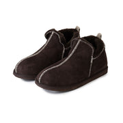 Soft ankle-high sheepskin slippers for men. The slippers have a slit on the sides making them easier to put on and take off. The stiching is in contrasting colours. The slippers have fabric binding around the the sole. The tag at the back is made from naturally coloured jute cloth and has printed text on it. The outer sole is made from EVA.