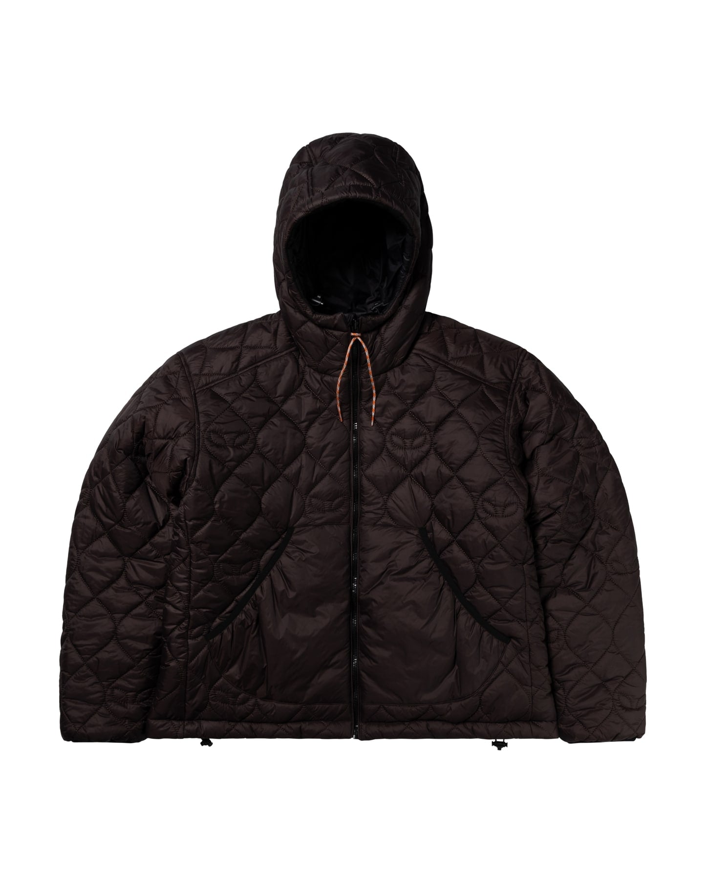 - Unisex hooded puffer jacket with padded alien-o stitch detailing, fully reversible with brown on one side and black on the reverse.