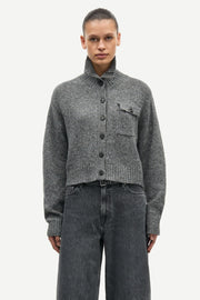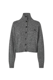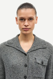 Cardigan with a loose fit and dropped shoulders. Button closure on the front. Buttoned patch pocket at the chest. Rib-knitted collar, cuffs, and hem. High neck. Melange look. Main material made from a recycled wool-blend.