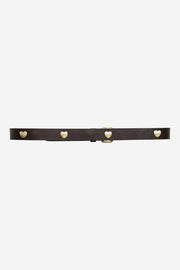 The Tylor Belt is made from leather and features a metal buckle, as well as rivets in the shape of a Heart motif. This style comes in its own box.