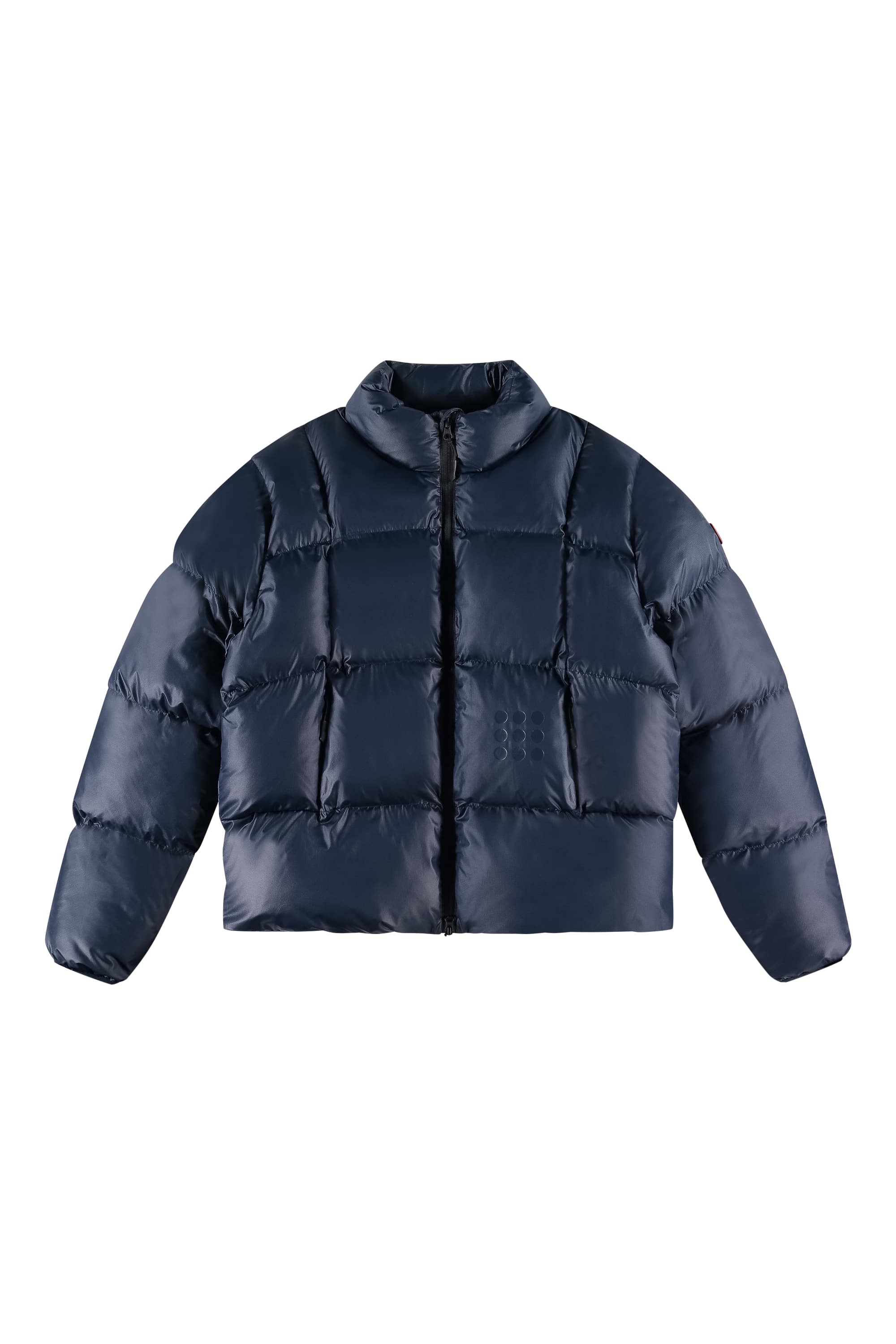 introducing the 9-dots curve puffer jacket in navy blue. crafted with a modern curved lining, this jacket features a signature 9-dots logo and offers premium warmth without the bulk. the shell and filling are made entirely from recycled plastic bottles.