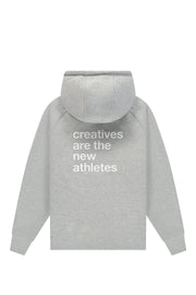 the rebranded catna hoodie in grey melange features an emblem logo embroidered on the left chest and the bold catna phrase “creatives are the new athletes” printed across the back.