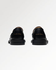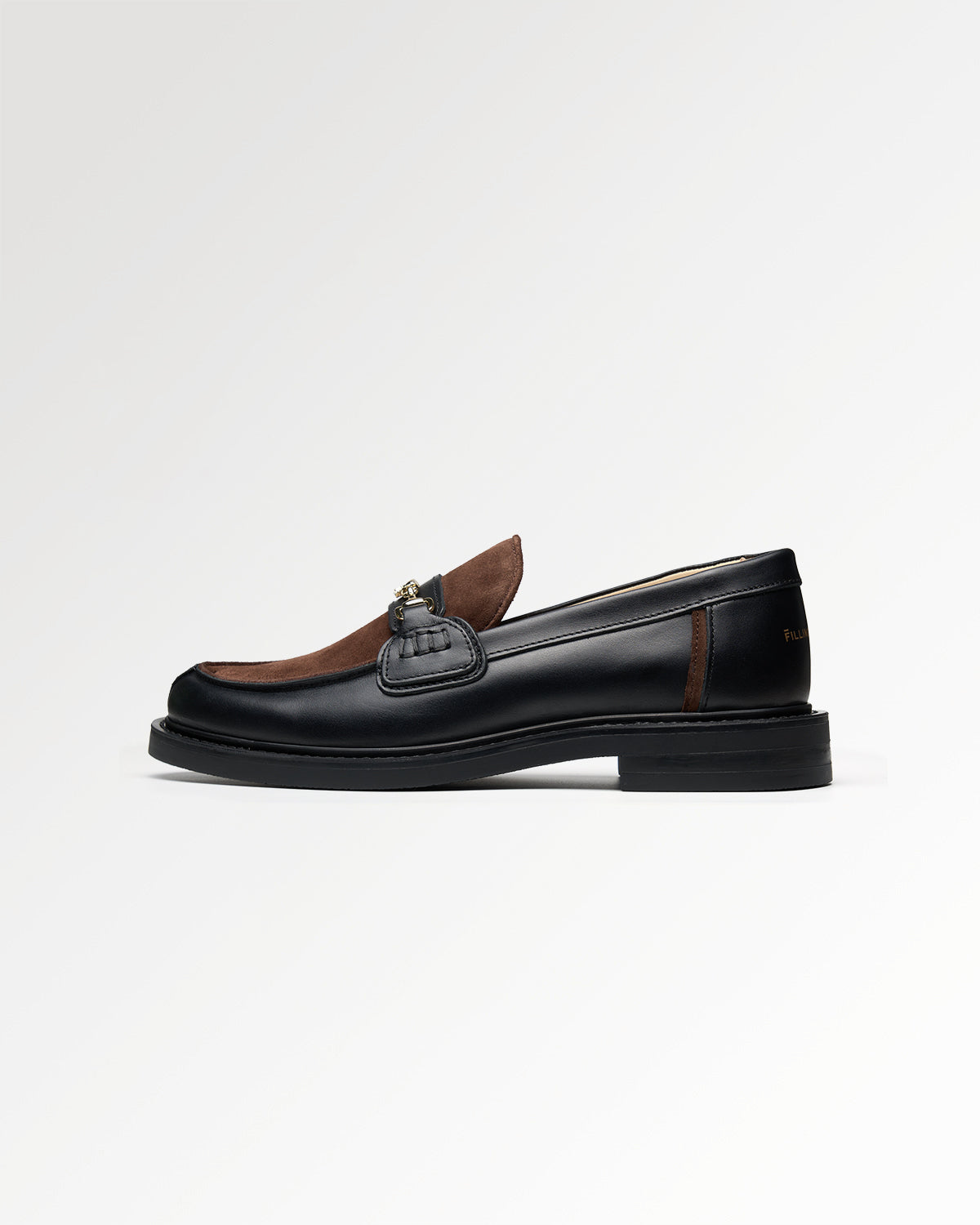 The Loafer Hazy Brown offers a rich, sophisticated contrast on a heritage silhouette. The substantial body of the shoe is crafted from smooth black Nappa leather, setting a strong foundation for the warm Hazy Brown Suede insert across the tongue and apron. Built on a durable Rubber sole and featuring full Leather lining for ultimate comfort, the look is completed with a classic, custom hand-shake hardware in gold.