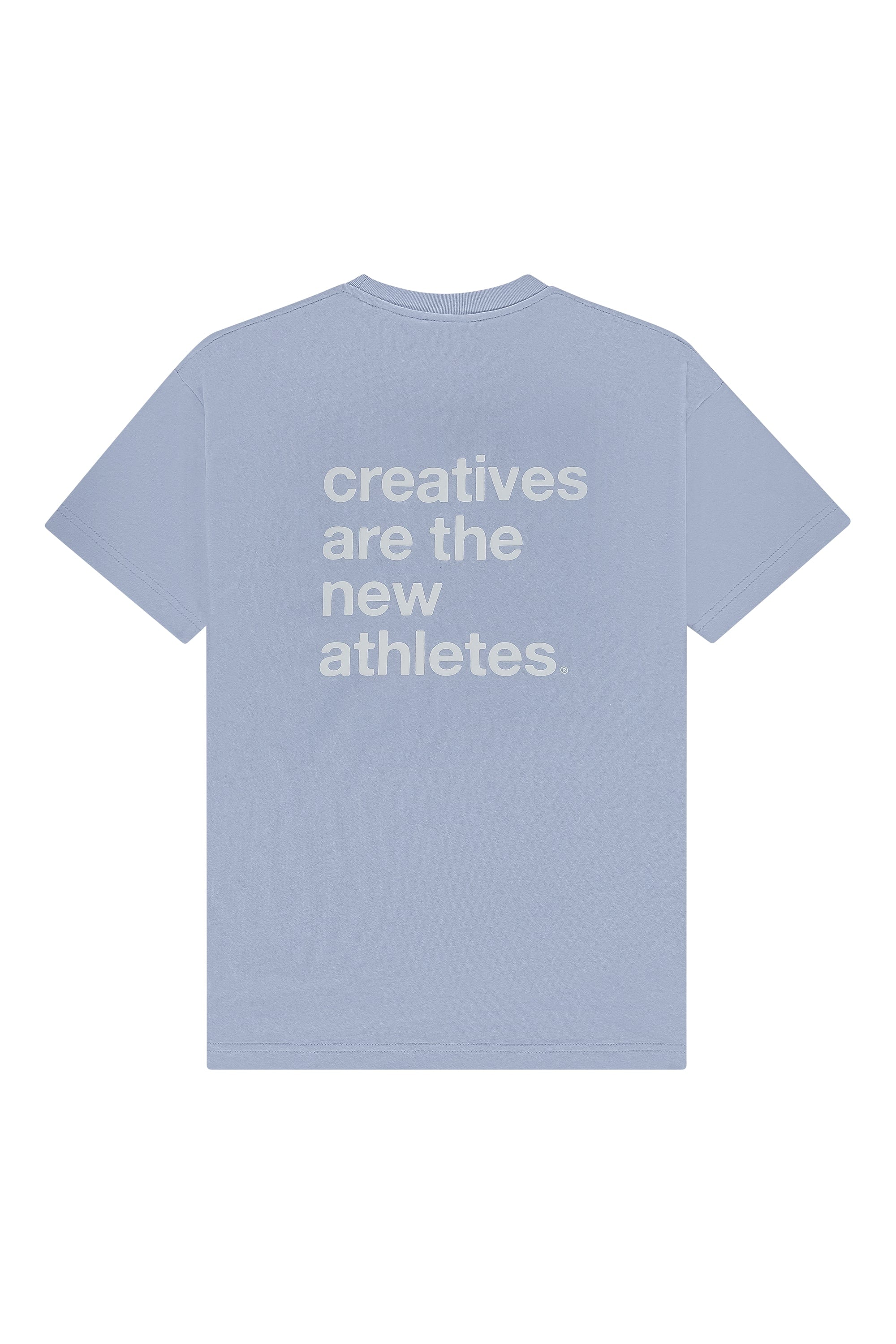 The CATNA tee in lush blue features the classic TNO emblem logo embroidered on the left chest, while the back carries their statement phrase: creatives are the new athletes, screen-printed.