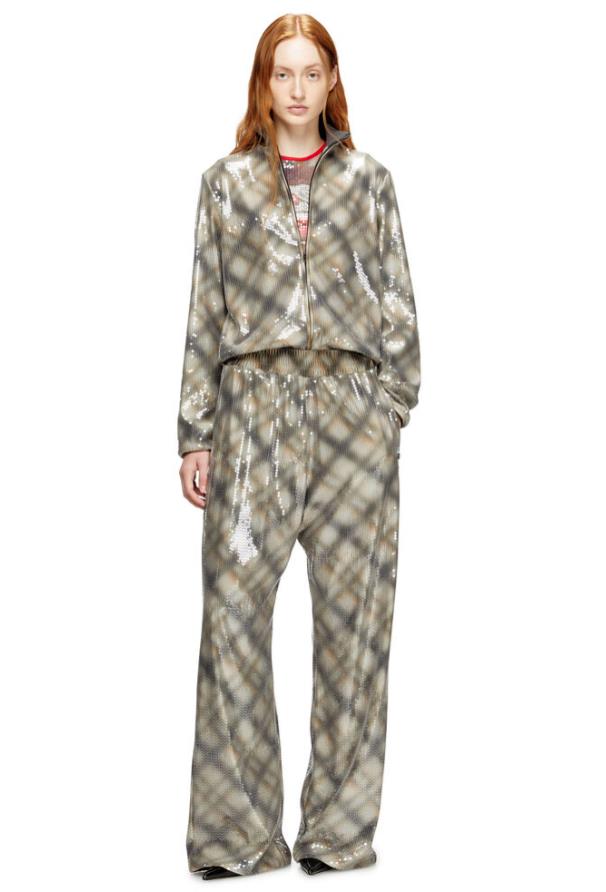 Women's regular-fit turtleneck sweater, crafted from a comfortable nylon-elastane blend in a warp knit, finished with ribbed highlights. It showcases an all-over transparent sequin application that illuminates the underlying check pattern. Practical details such as invisible zippers in the pockets and a center front zip make it as practical as it is stylish. The metal Oval D plaque is positioned at the back, adding a signature Diesel touch.