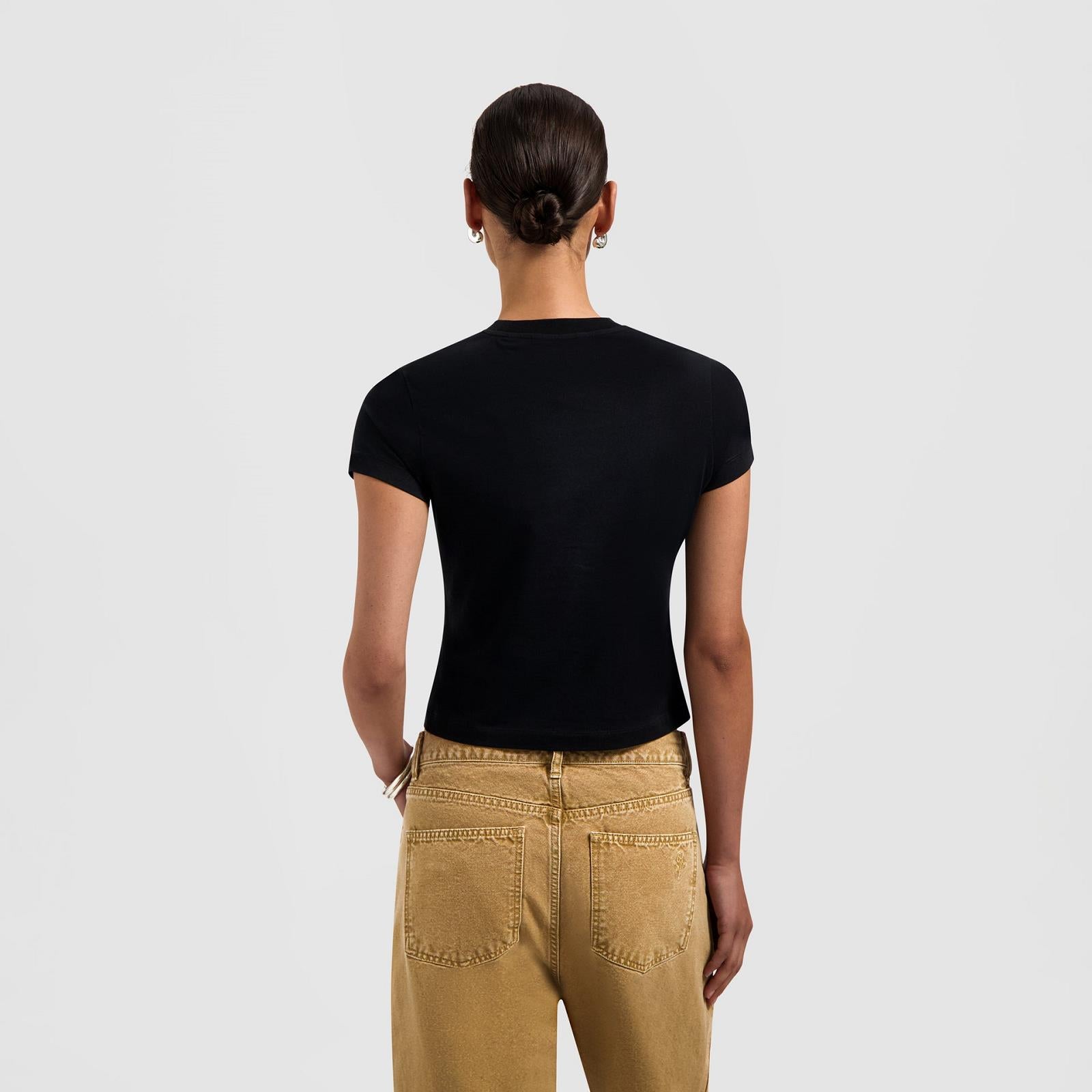 The Olaf Tape Baby Tee in Black reimagines a fitted baby tee with a taped logo on the front. Made from a soft organic cotton blend with a hint of stretch, it offers a clean and contemporary feel for everyday wear.